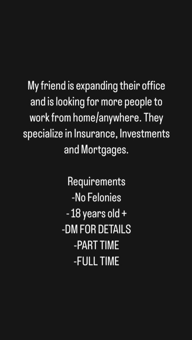 The company I work with is looking for some people to work from home in the finance space. Anywhere in the country, all online, paid training, and bonuses as well. Who's interested? I'd be glad to connect you.